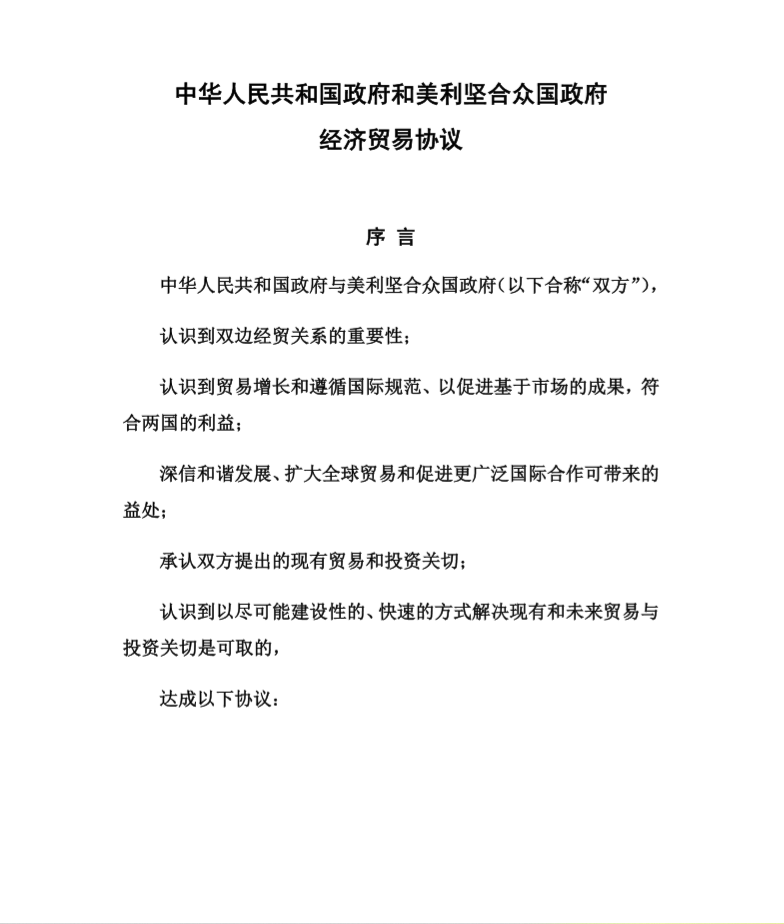 美东时间1月15日上午,中美第一阶段经贸协议签署仪式在美国白宫东厅举行。中共中央政治局委员、国务院副总理、中美全面经济对话中方牵头人刘鹤与美国总统特朗普共同签署协议文本并致辞。协议文本包括序言、知识产权、技术转让、食品和农产品、金融服务、汇率和透明度、扩大贸易、双边评估和争端解决、最终条款九个章节。