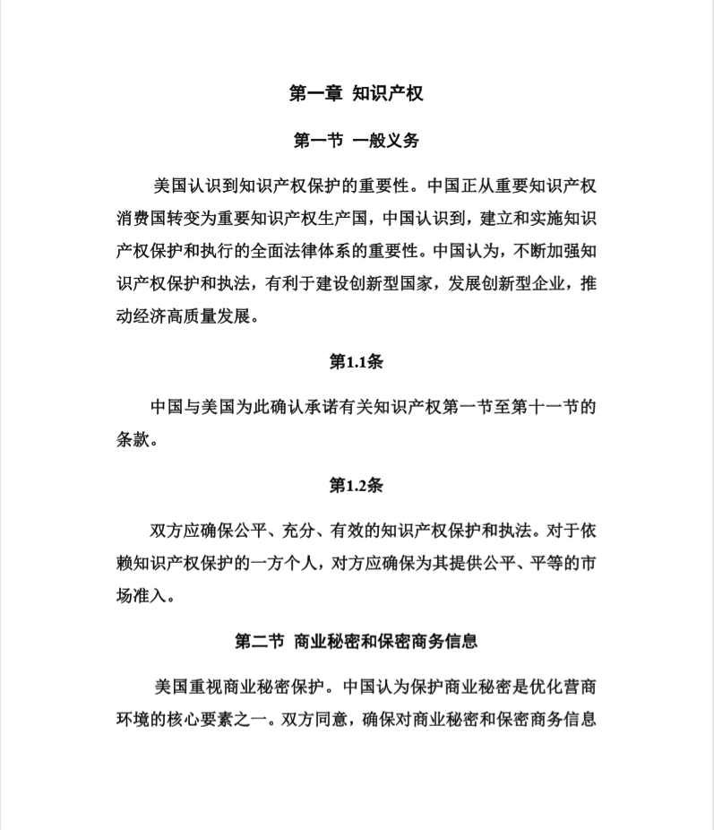 知识产权作为首章出现在中美经贸协议中,其重要性不言而喻。在该章节,中美双方在商业秘密保护、与药品相关的知识产权问题、专利有效期延长、地理标志、打击电子商务平台上存在的盗版和假冒、打击盗版和假冒产品的生产和出口、打击商标恶意注册,以及加强知识产权司法执行和程序等方面达成共识。